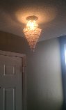 We found three glass balls at Goodwill Outlet for $0.49 a pound! We joyfully took down the plain balls and added these. In the entrance way we wanted a chandelier but our ceilings are to low. We solved that problem buy taking the lights out of a beaded Christmas tree and turning it upside down to equal VERY inexpensive and pretty cool chandelier. All new light for less then $5.
