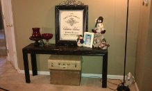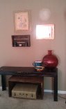 The sofa table was given to us by our mom's friend for FREE! We just had to paint it black. We added some lighter touches and made the the sofa table less crowed. We nailed an old wooden box to the wall and put in teal insulators caps and have since added a "U" . In the up right corner we actually just nailed plastic doilies to the wall. It really looks clean and fresh!