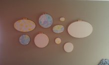 We have a habit of collecting old fabrics and stitching circles so it was a no-brainer that we would use those on our wall. We think decorating the entire wall cost around $4. The fabric and "frames" have been all collected at goodwill.