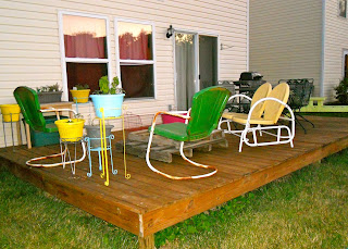 Our first step was to downsize on the furniture. We sold the one of green chairs (the other is still for sale), got rid of the pallets and the pink bucket aka "center piece" was retired. I bought those cute pillows at Meijer for $2.25 each. I normally don't buy new, but I do buy clearance! The flower pots were ones I've had forever. I had bought them at a garage sale for 10 cents each. I went to Ace and got yellow spray paint ($3.99) so they would match, I also bought it in the turquoise color to paint the plants stands that Mama gave me ($3.99). The yellow glider was Heather's Easter present from the bunny. It was also the color that we worked around, hence all of the yellow!