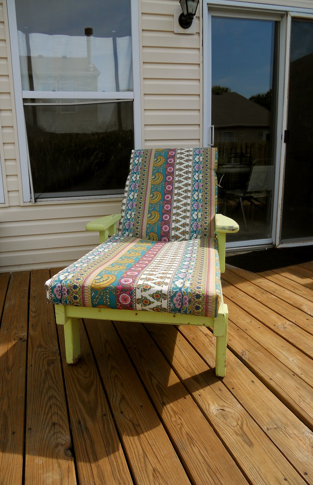 Mama found THE perfect cushion for my lounge chair. It's bright, colorful and comfortable! That's is what I call perfect! Just adding the cushion makes the $2 chair look like $200. O.k. so maybe not $200 but you get the idea!
