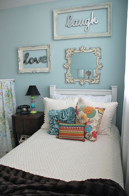 This bedroom is from Vintage Wren, another new to me blog that will be consuming my weekend! I love the blue walls which, dare I say, I would take maybe even a little lighter. (What is happening to me?) I love the bright colors of the pillows. Another VERY easy thing to change out when I get board of my room. I love the mirrors on the wall but I wouldn't use that headboard for my room. I guess I'm not sure if I would even use a headboard at all....Things to think about!