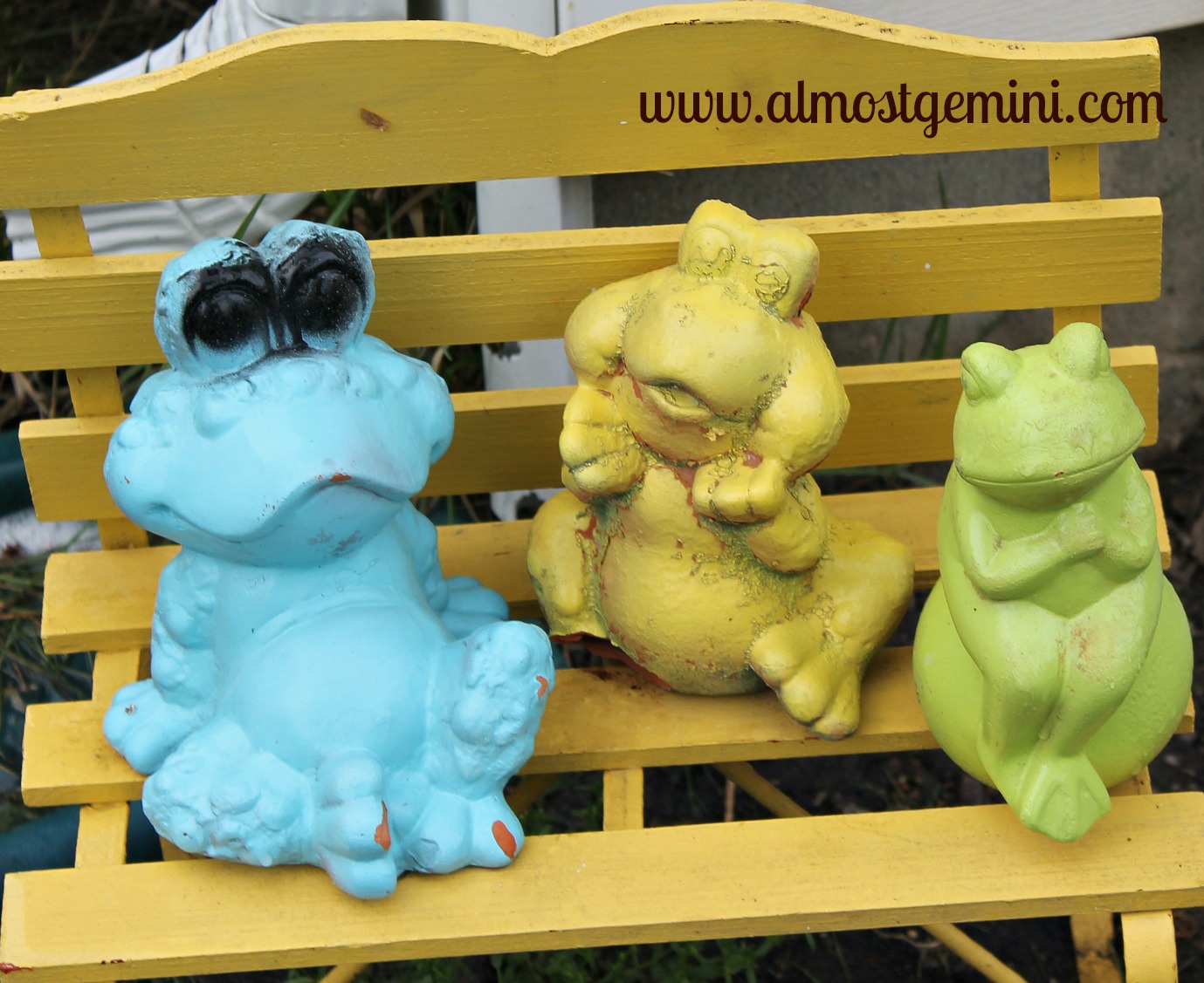 Earlier this year, I was having cabin fever and gave a new coat of paint to some of my other lawn frogs. The yellow one has recently lost his leg courtesy of my three year old neighbor.