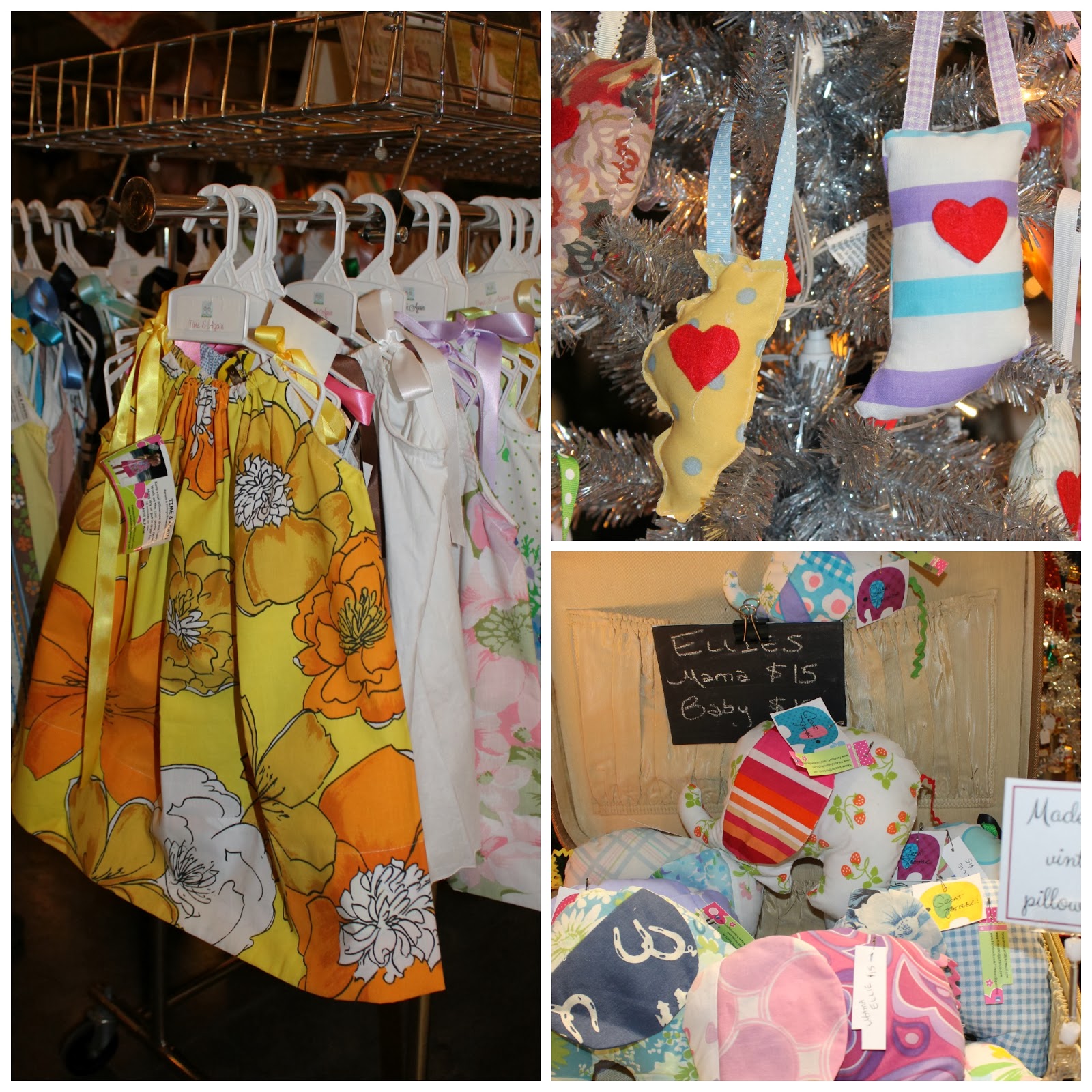 My first stop was to a lovely lady named Allison and her goodness that is Time & Again Shop. She uses old pillowcases (the nice soft cuddly ones) and makes pillow case dresses. She also makes sweet "Ellie" the elephants and super cute Indiana Christmas ornaments. (Which is what she donated) Check out her goodness!
